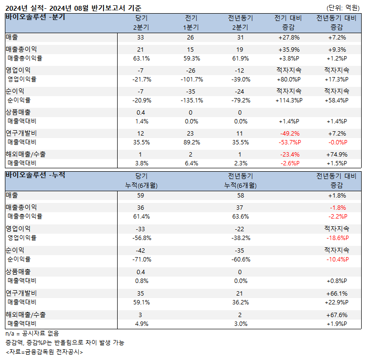 바이오솔루션 상반기 총매출은 59억원으로 전년 같은 기간 대비 1.8%(1억원) 증가했다. 이어 전년 상반기 대비 매출총이익은 36억원으로 1.8%(1억원) 감소, 영업이익 -33억원으로 적자지속(-11억원), 순이익 -42억원으로 적자지속(-7억원)으로 집계됐다. 상품매출은 0.4억원, 연구개발비는 35억원으로 66.1%(14억원), 해외매출은 3억원으로 67.6%(1억원) 증가한 것으로 나타났다.