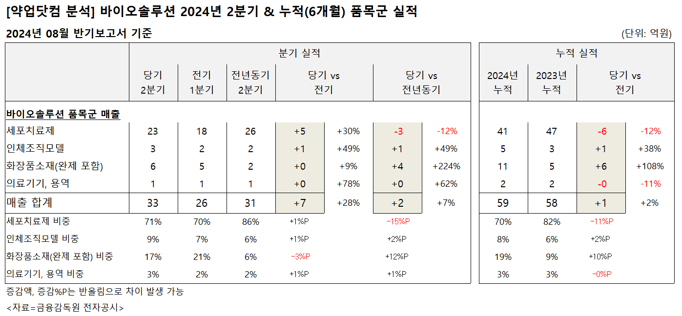 약업닷컴(약업신문)이 바이오솔루션 2024년 8월 반기보고서를 분석한 결과, 바이오솔루션의 올해 상반기 매출 중 세포치료제가 80%를 차지하는 것으로 나타났다.