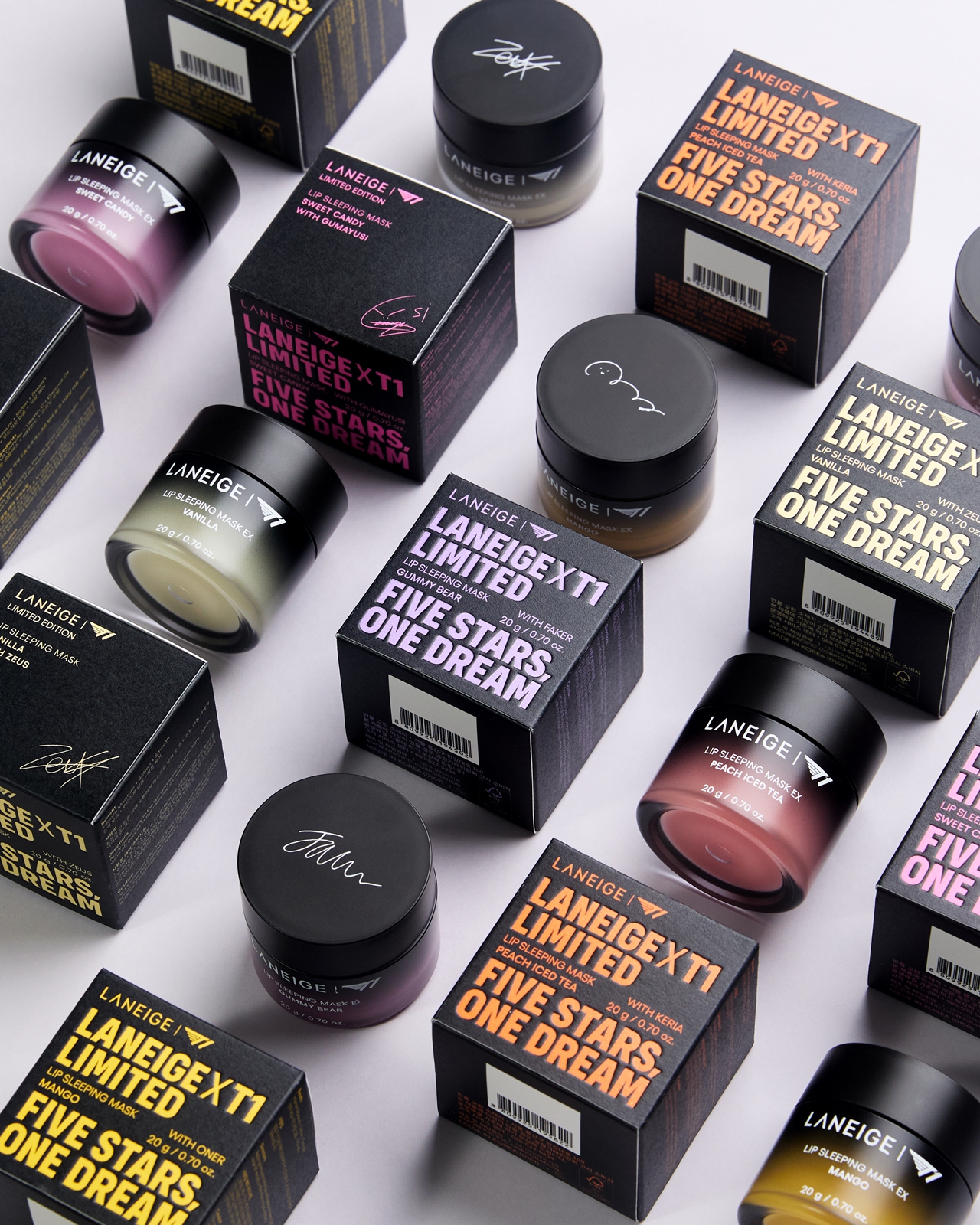 한정판 라네즈 '립 슬리핑 마스크'를 통해 한국에 새롭게 선보이는 다섯 가지 향은 T1 선수 5인이 직접 선택했다. '제우스' 최우제 선수는 바닐라 향, '오너' 문현준 선수는 망고 향, '페이커' 이상혁 선수는 거미 베어 향, '구마유시' 이민형 선수는 스윗 캔디 향, '케리아' 류민석 선수는 피치 아이스 티 향을 각각 골라 특별함을 더했다. T1을 상징하는 무광 검정색 패키지에 선수별 사인을 담아 소장 가치도 높였다.