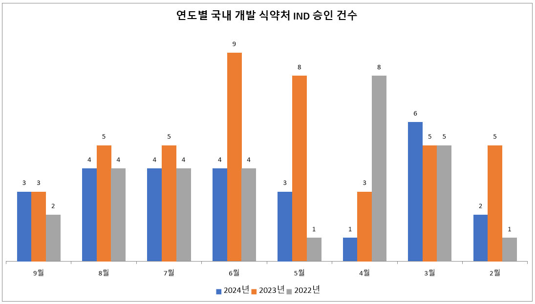 특히 최근 3년간 같은 기간 동안 승인된 전체 IND 건수는 거의 비슷한 수준을 유지하고 있다. 즉, 글로벌 빅파마가 주도하는 임상시험은 큰 영향을 받지 않았다는 의미다. 2024년 2월부터 9월까지 전체 IND 승인 건수는 143건, 같은 기간 2023년은 155건, 2022년은 154건으로 큰 차이가 없다.