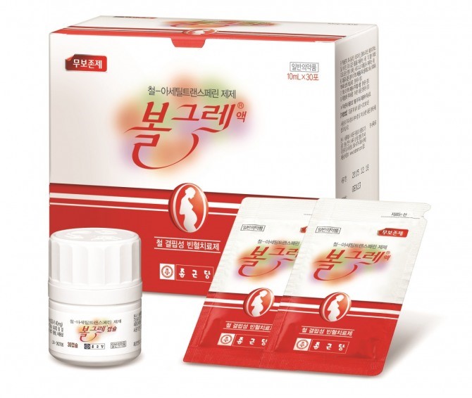 종근당 볼그레는 임산부가 하루 철분 섭취 권장량을 충분히 섭취할 수 있도록 1회 복용량에 40mg의 철분을 함유하고 있으며 비타민, 무기질 등 다른 성분을 첨가하지 않은 단일 성분의 철분제다. 철분의 흡수율을 높이고 부작용을 줄인 것이 특징이다.