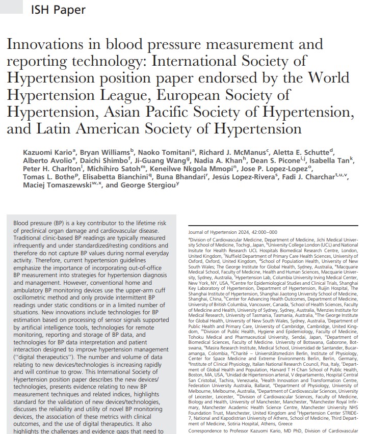 국제고혈압학회(ISH)가 최근 일본 자치의대 카리오 카즈오미 (Kario Kazuomi) 교수가 발표한 공식 입장문(Position Paper)에서, 한국 스마트 반지 ‘카트 비피’ 우수성을 인정했다.