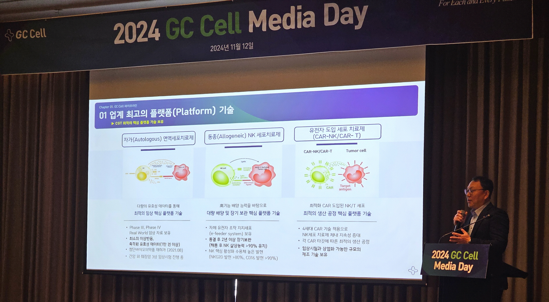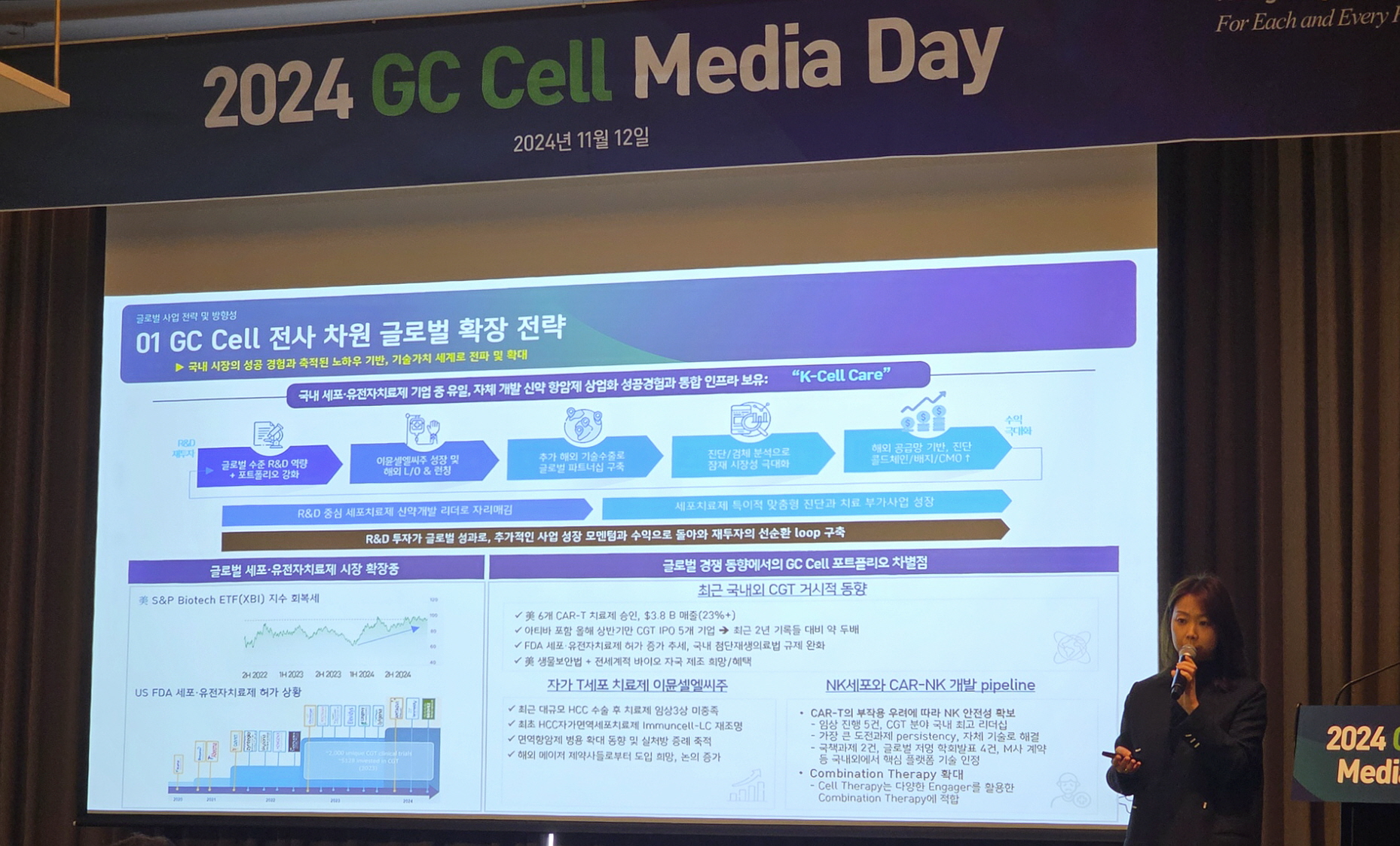 제임스박 대표는 "오늘의 주제인 ‘K-Cell, Cure for Tomorrow’는 지씨셀이 세포·유전자치료제 분야에서 세계적 선도 기업으로 나아가는 이정표"라며 “세포치료제 시장에서 한류를 선도하며 글로벌 경쟁력을 강화하는 구체적인 전략을 소개하고자 한다”고 말했다.