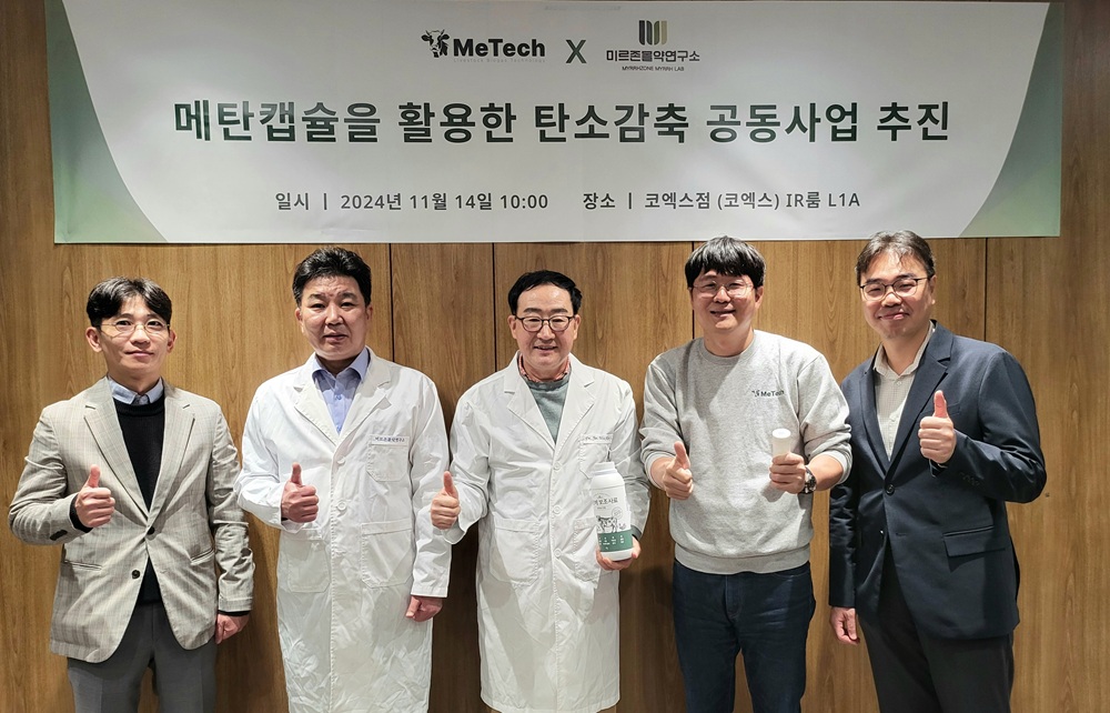 미르존몰약연구소 연구소장인 김진우 박사는 “가축의 건강은 인류의 생존과 복지와 직결되는 중요한 문제다. 메텍과 MOU를 통해 카르베 보조사료가 탄소발생량을 줄일 수 있게 되길 기대하고 있다. 몰약복합추출액(MHS-90)이 함유된 카르베 보조사료와 메텍에서 개발한 메탄캡슐을 활용하여 초이랩과 함께 가축 메탄가스 절감 연구에 착수하겠다”라고 전했다.