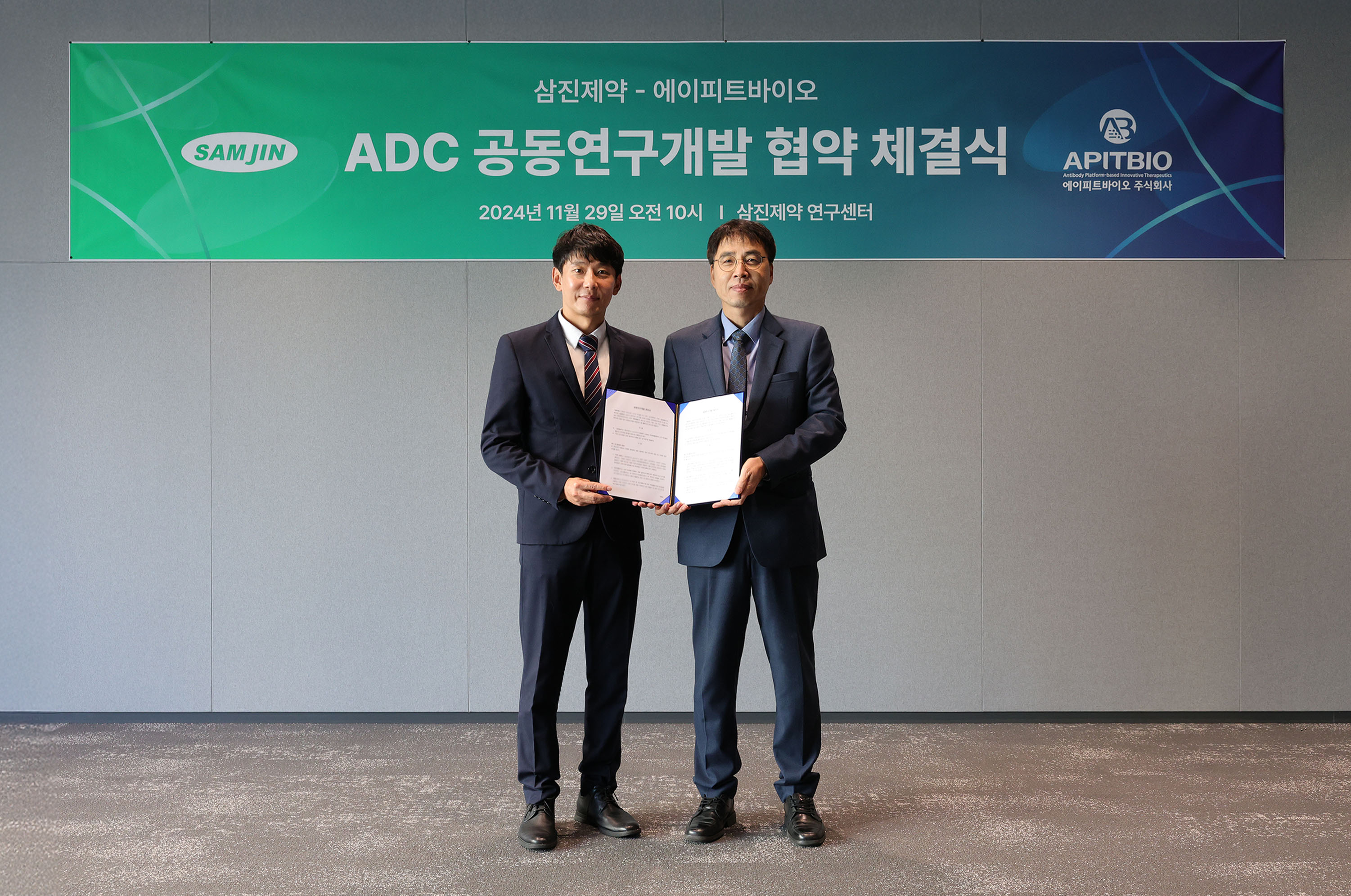 삼진제약(대표이사 최용주)이 지난달 29일, 항체 신약 개발 전문기업 ‘에이피트바이오(APITBIO, Inc.,대표이사 윤선주)’와 ‘ADC(Antibody-drug conjugates, 항체-약물접합체) 신약 개발’을 위한 공동연구 협약을 체결했다.