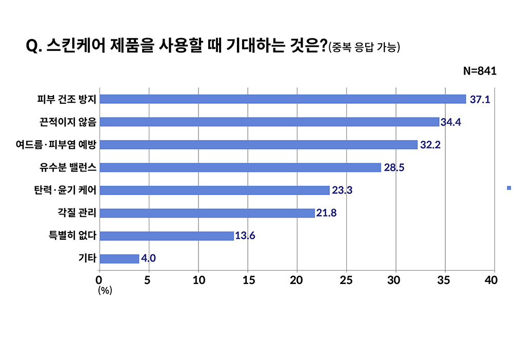 끈적이지 않는 것(34.4%), 여드름·피부 염증 예방(32.2%)이 각각 2, 3위를 차지했다. 유수분 밸런스(28.5%), 탄력·윤기 케어(23.3%), 각질 관리(21.8%) 등이 뒤를 이었다. 설문 보고서는 남성 소비자의 경우 피부 고민 예방과 제품의 텍스처를 중요하게 생각하는 경향이 있다고 분석했다.