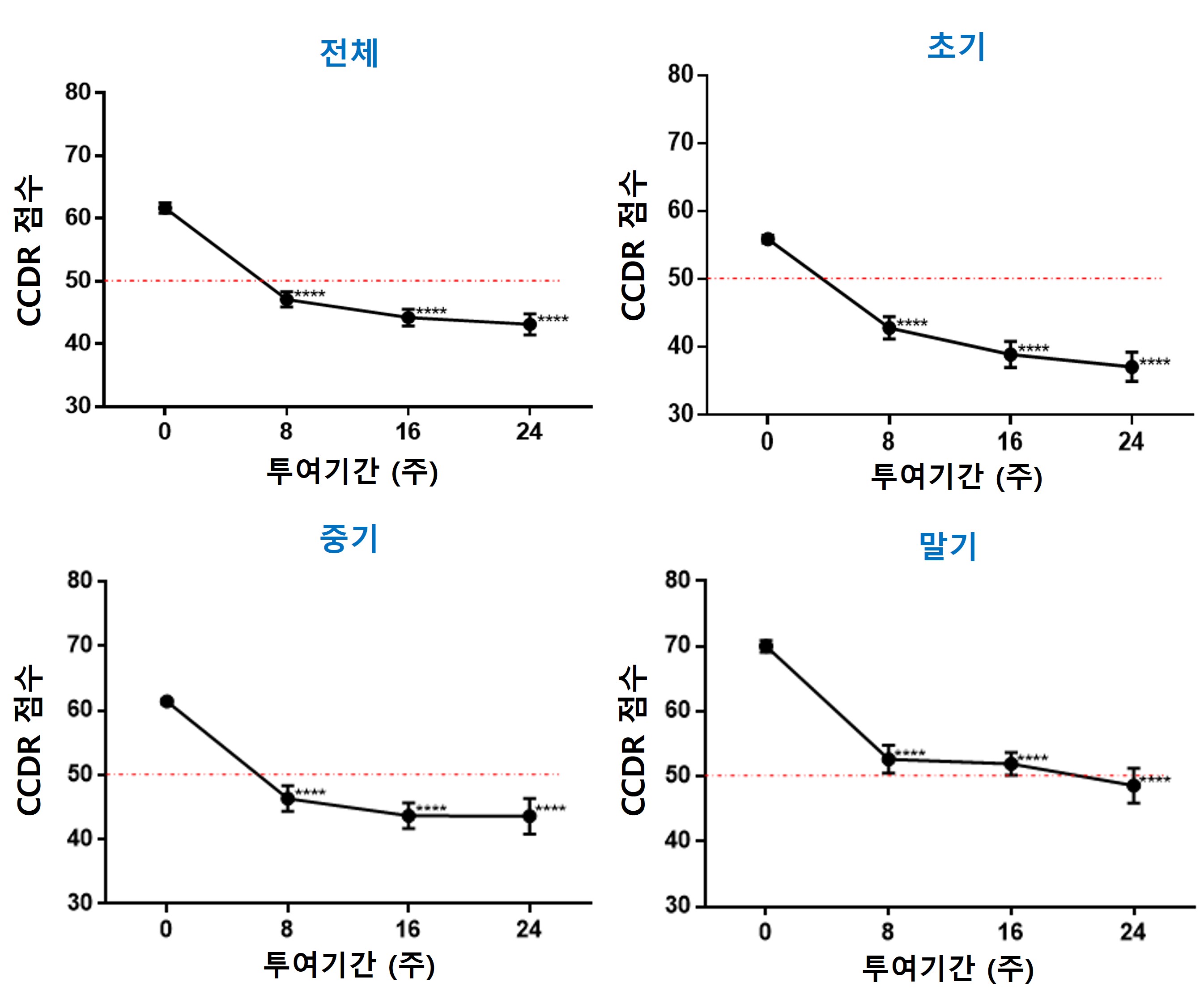 인지기능장애지수 (CCDR) 평가(50점 이상이면 인지기능장애)에서 초기, 중기의 경우 8주만에 대부분 50점 이하로 감소했으며 말기인 경우에도 장기간 꾸준히 복용했을 때 50점 미만으로 떨어지는 것으로 확인됐다.