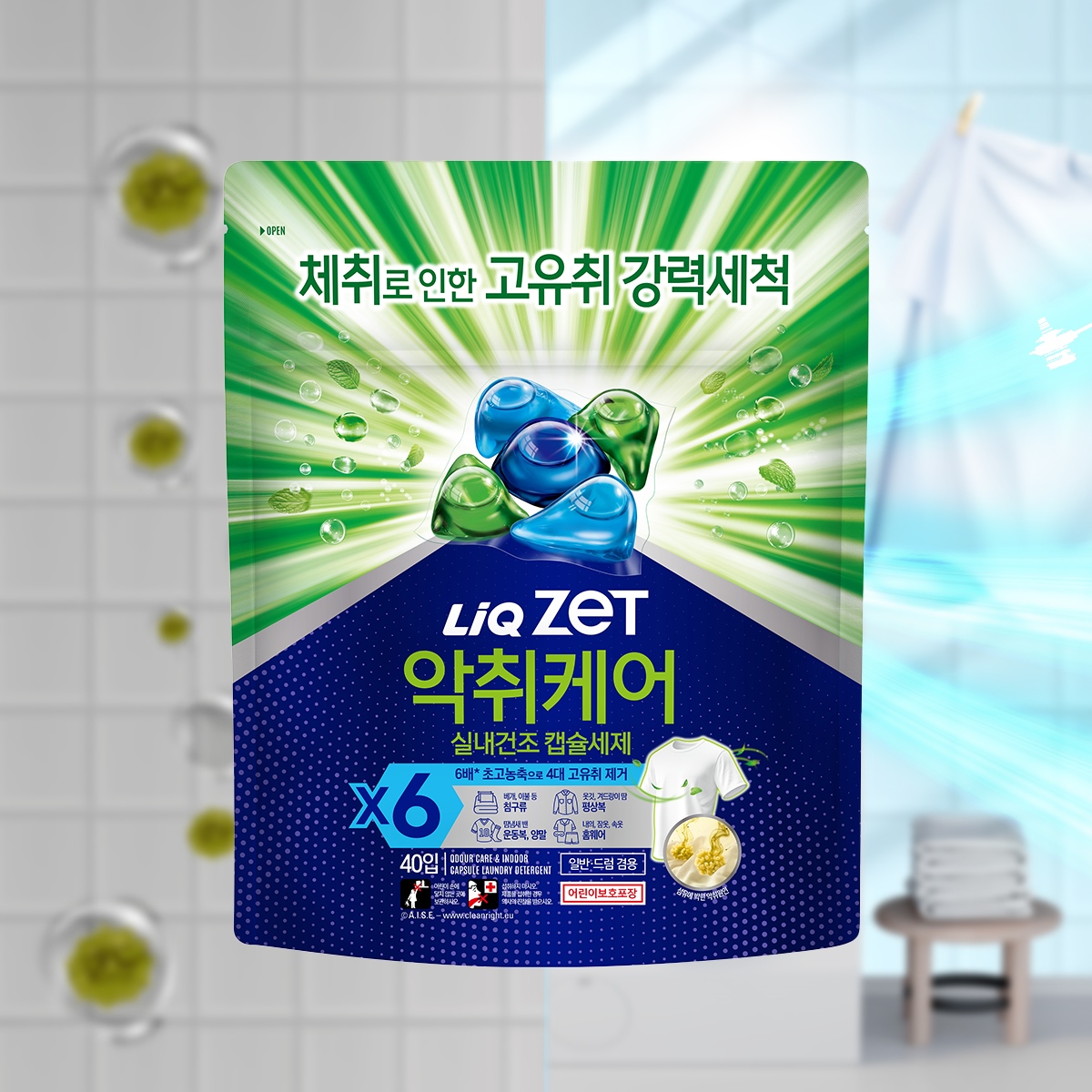 리큐 제트 악취케어 실내건조 캡슐세제는 땀 냄새가 스며든 운동복부터 옷깃 이 쉽게 거뭇해지는 평상복, 매일 입고 덮는 홈웨어 및 침구류까지 섬유에 남아있는 악취를 효과적으로 제거하고 산뜻한 향을 남겨주는 캡슐 형태의 세제다.