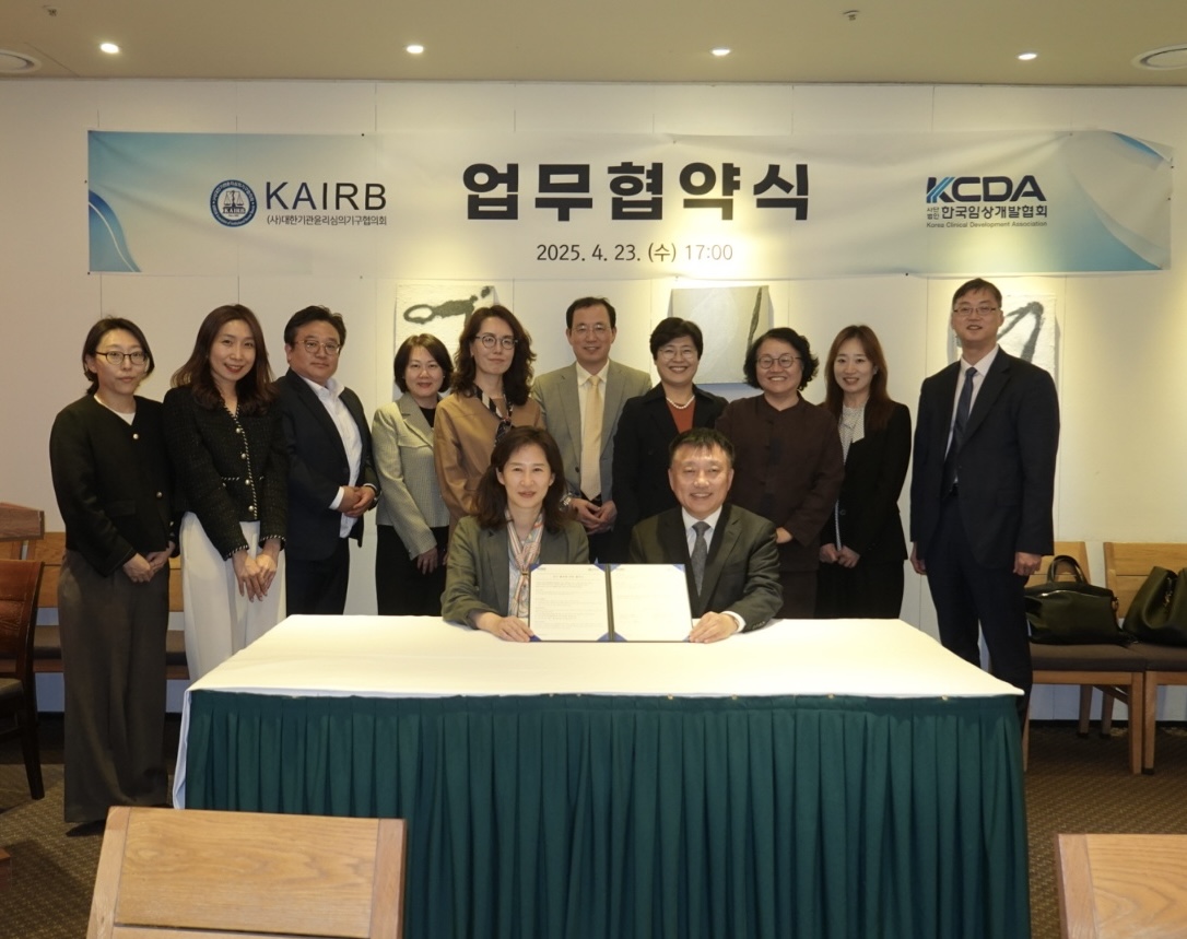 한국임상개발협회(회장 임윤희, 이하 KCDA)는 23일 국내 임상시험 산업의 발전과 효율적인 연구 환경 조성을 위해 대한기관윤리심의기구협의회(회장 김병수, 이하 KAIRB)와 업무 협약(MOU)을 체결했다고 24일 밝혔다.