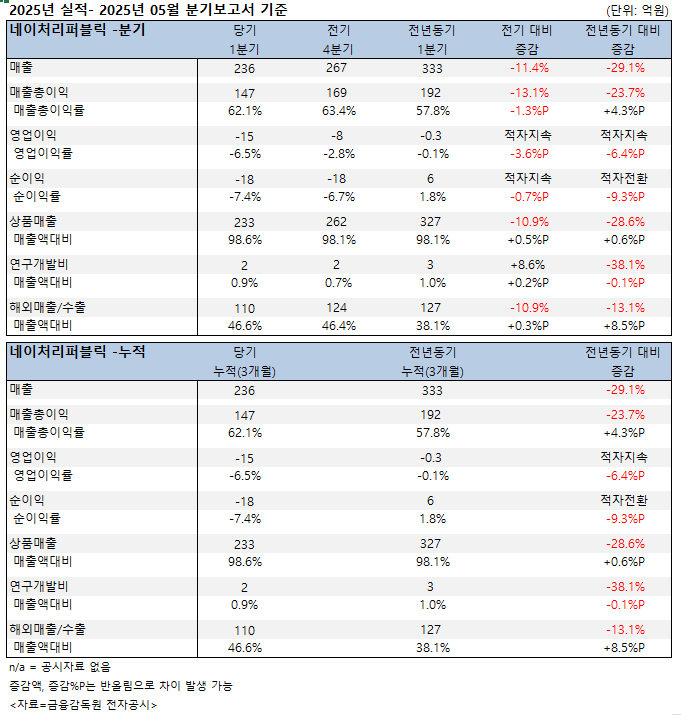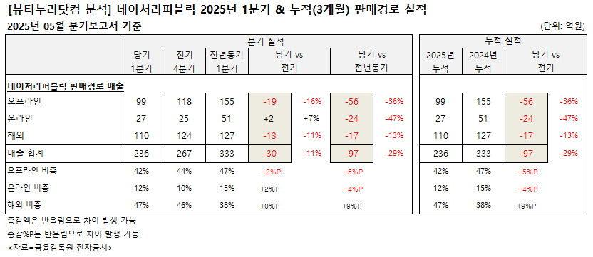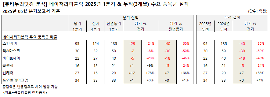 약업신문 자매지 화장품신문이 금융감독원 공시 2025년 5월 분기보고서(연결기준) 분석 결과, 올해 1분기 네이처리퍼블릭은 236억원의 매출을 기록했다. 전기 267억원 대비 11.4%, 전년동기 333억원 대비 29.1% 각각 감소했다. 15억원의 영업손실이 발생, 영업손실을 기록했던 전기(-8억원) 및 전년동기(-3000만원)에 이어 적자상태다. 18억원의 순손실을 기록했다. 18억원의 순손실을 냈던 전기에 이어 적자다. 6억원의 순이익을 냈던 전년동기 대비 적자전환했다.