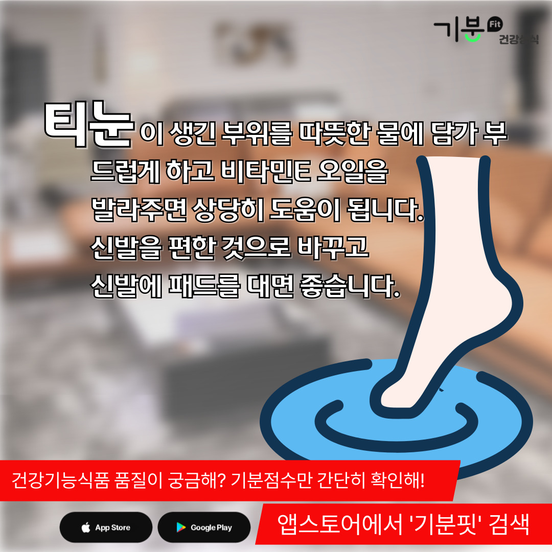 티눈이 생긴 부위를 따뜻한 물에 담가 부드럽게 만든 후, 환부에 비타민E 오일을 발라주면 상당히 도움이 된다.