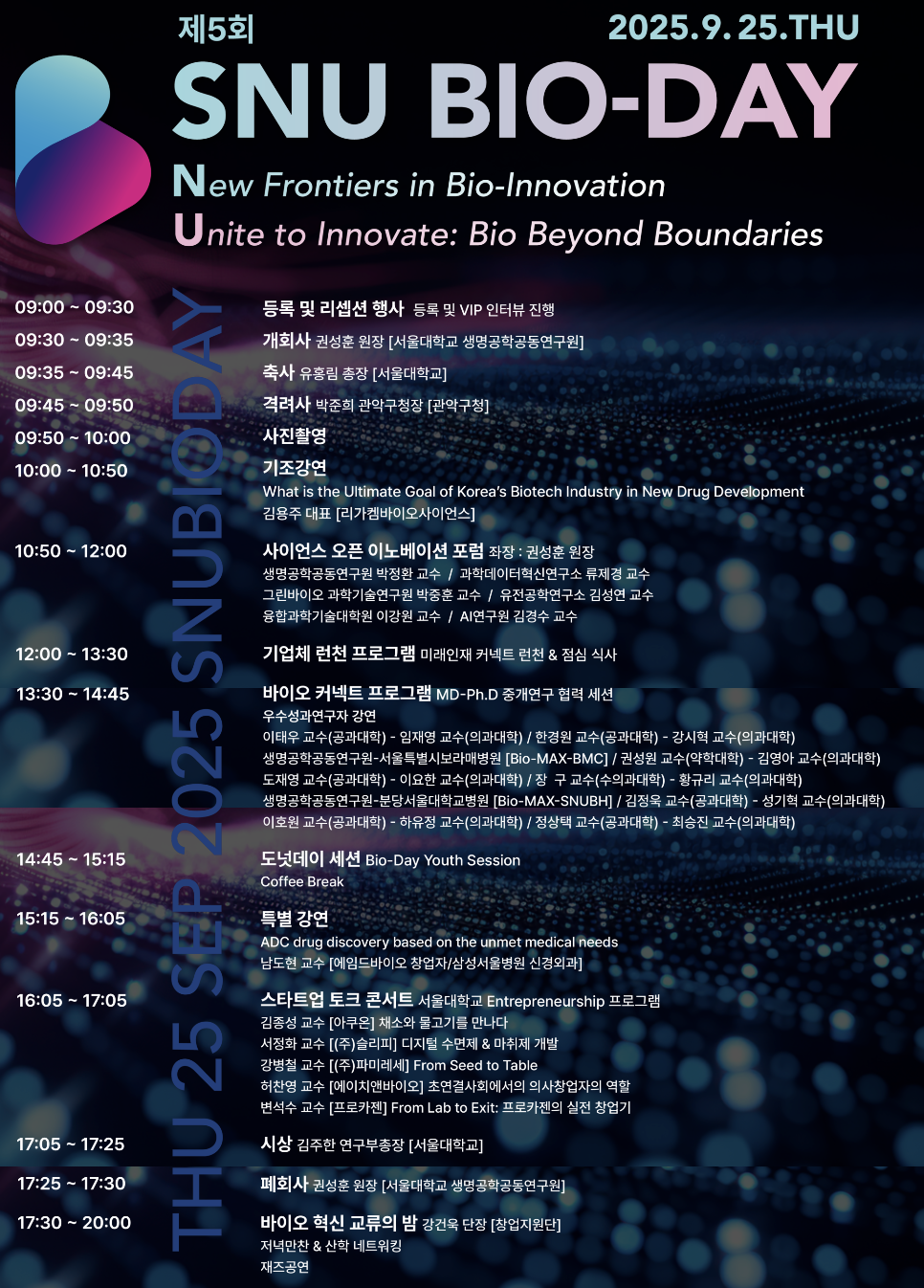 올해로 5회째를 맞는 SNU BIO-day는 학계·산업계·투자계·창업 생태계가 한자리에 모이는 국내 바이오 분야 핵심 네트워킹 플랫폼으로 자리매김하고 있다. 지난해에는 약 800여 명이 참석해 성황을 이뤘으며, 올해는 한층 더 확대된 규모로 진행될 예정이다.