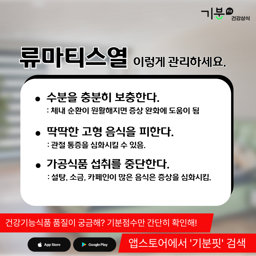 관절통증과 열이 심해질 대는 딱딱한 음식을 피하고 과식하지 않도록 주의해야 한다.