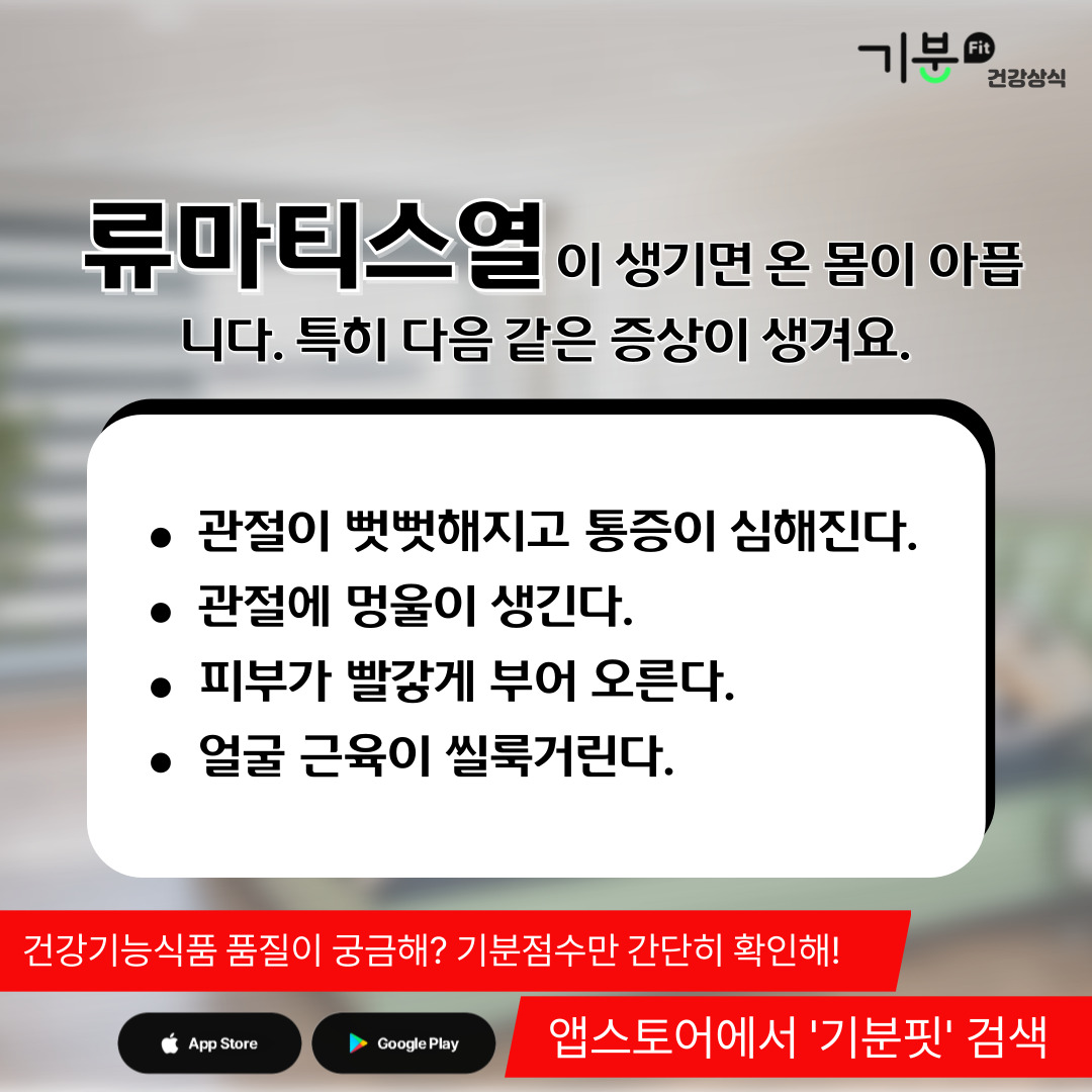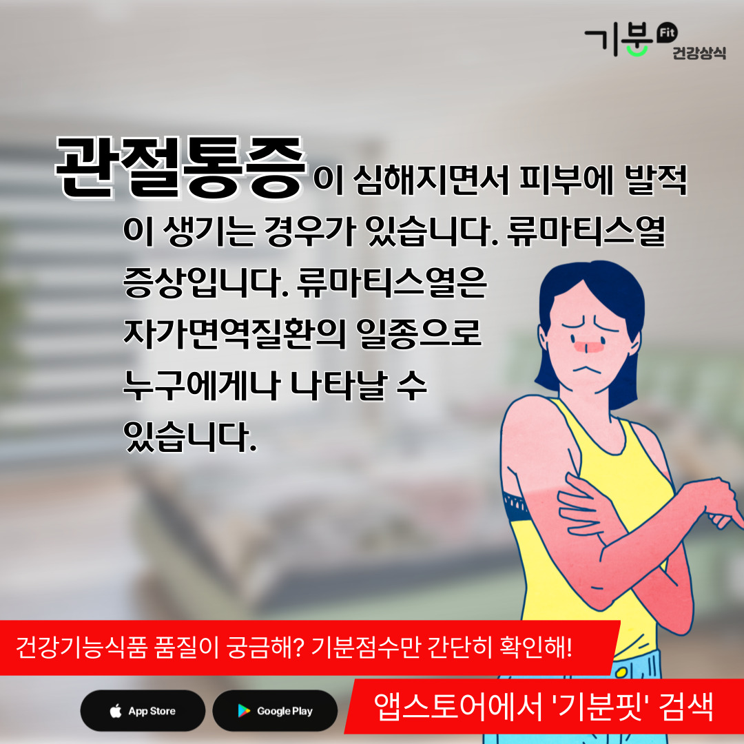 심한 관절통증이 오면서 관절이 뻣뻣해지고, 피부에 빨간 발적이 생기는 경우가 있다.