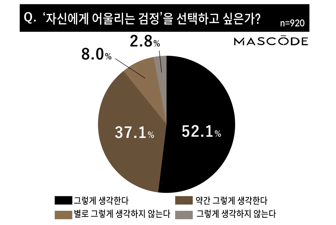블랙 아이라이너는 여전히 강세를 보이고 있다. ‘블랙 아이라이너가 무난한 정석 아이템이라고 생각하는가’라는 질문에는 88%가 그렇다고 답했다. 그러나 동시에 응답자의 89.2%는 ‘자신에게 어울리는 블랙을 선택하고 싶다’고 밝혔다. 블랙을 기본 아이템으로 인식하면서도, 단순한 정석을 넘어 개별적 취향과 맞춤형 선택을 중시하는 흐름이 강해지고 있음을 보여준다. 조사 보고서는 이 결과에 대해 블랙 아이라이너가 기능적 화장품을 넘어 자기 표현의 도구로 자리잡아가고 있다고 해석했다.