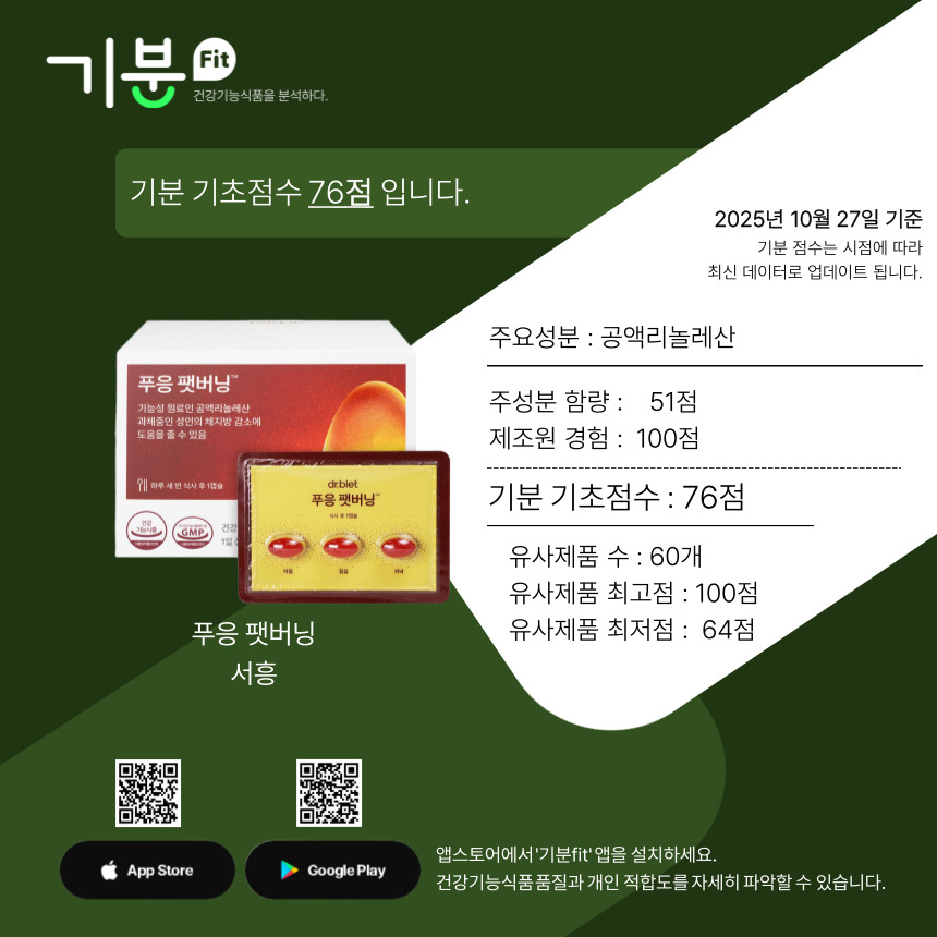 본 건기식 리뷰에 소개하는 기분점수는 성분 함량과 제조사 정보를 토대로 한 기초 점수다. 기분 Fit 애플리케이션을 설치하고 자신의 건강, 체질, 선호 정보 등을 입력하면 사용자 개개인에 맞춘 점수를 확인할 수 있다.