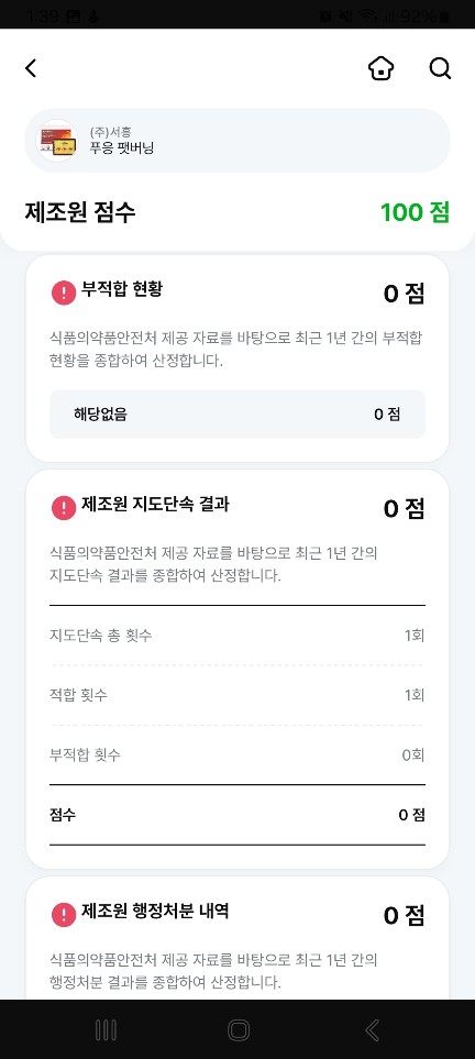 지난 1년간 부적합 사례는 없었고 지도단속이나 행정처분 사례도 없었다.