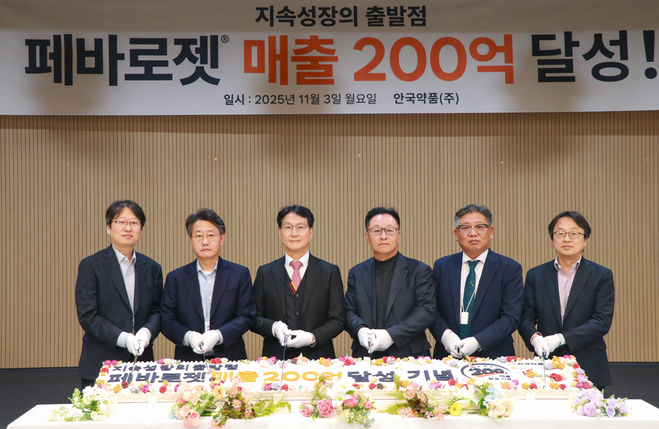박인철 대표(왼쪽에서 세 번째). ©안국약품안국약품(대표 박인철)은 지난 11월 3일 과천 본사 강당에서 이상지질혈증 복합제 ‘페바로젯(Pevarojet)’의 2025년 누적 매출 200억원 달성을 기념하는 행사를 개최했다고 밝혔다.