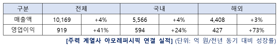 주력 계열사 아모레퍼시픽의 매출은 전년동기 4%, 영업이익은 41% 증가했다.