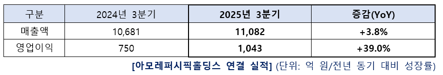 아모레퍼시픽그룹은 연결 기준 2025년 3분기 실적이 매출 1조1082억원, 영업이익 1043억원을 기록했다고 6일 밝혔다. 라네즈·에스트라·설화수 등 주요 브랜드의 글로벌 확장과 운영 효율화에 힘입어 견조한 성장세를 유지했다.
