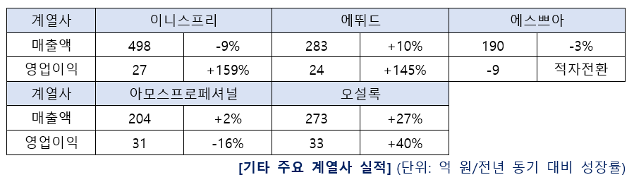 아모레퍼시픽홀딩스의 주요 자회사인 이니스프리, 에뛰드, 에스쁘아, 아모스프로페셔널, 오설록도 신규 트렌드 대응과 제품 경쟁력을 바탕으로 그룹 매출 및 영업이익 성장에 기여했다. 특히 메이크업과 티(Tea) 카테고리에서는 카테고리 전문성을 바탕으로 매출 성장을 이어갔다.