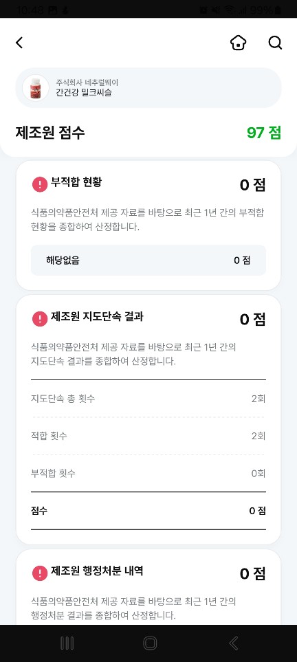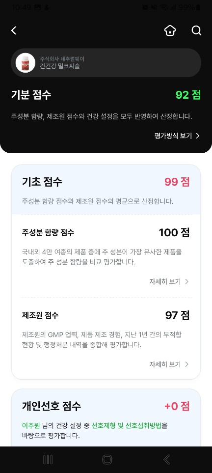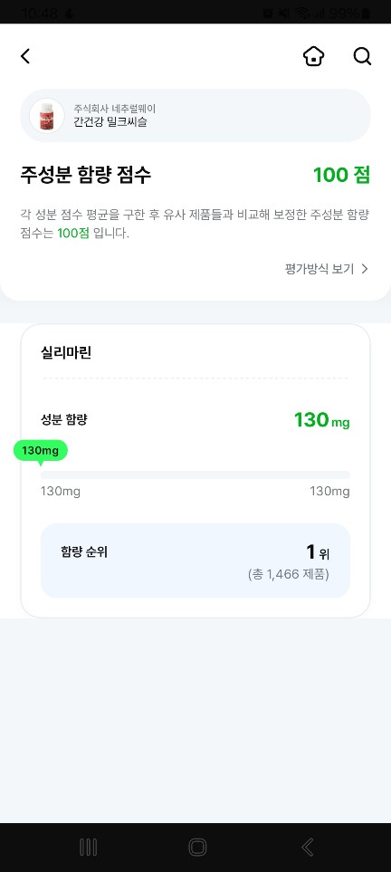 성분 함량 점수와 제조원 점수로 산출한 ‘오늘좋은 간건강 밀크씨슬’ 제품의 기초점수는 99점이다.