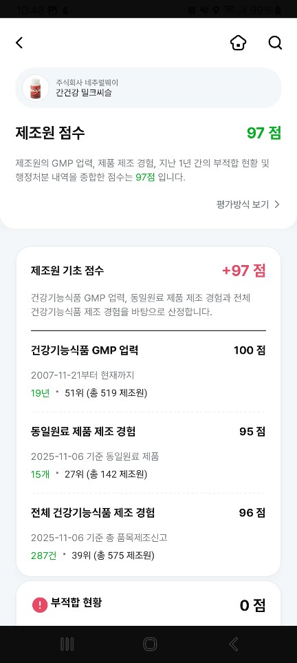 이러한 내용을 종합해 점수를 산출한 결과, 밀크씨슬 제품과 관련한 ‘네추럴웨이’의 제조사 점수는 97점으로 나타났다.
