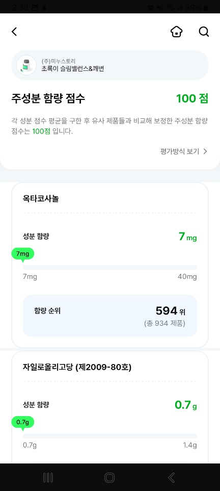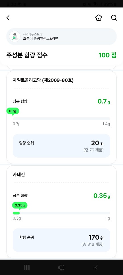 ‘올 뉴 초록이 시즌4’의 주성분 함량 점수는 100점이다.