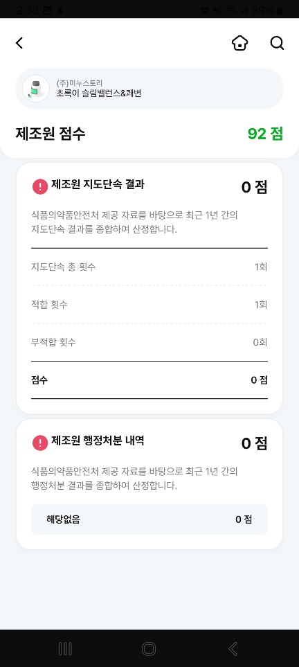 지난 1년간 부적합 사례는 없었고 지도단속이나 행정처분 사례도 없었다.