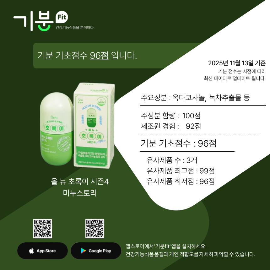 ‘올 뉴 초록이 시즌4’는 미누스토리에서 생산된 제품으로 기능성 원료로 옥타코사놀 함유 유지, 녹차 추출물, 자일로올리고당을 함유하고 있다.