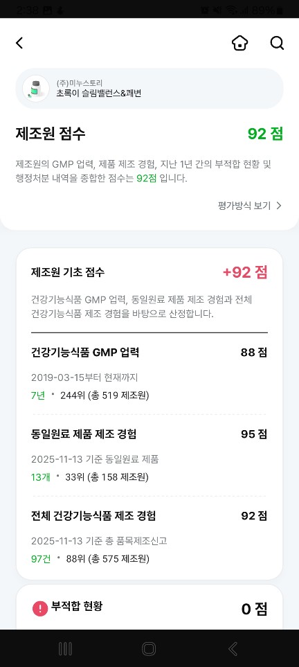 제조사 ‘미누스토리’는 GMP 업력 7년으로 비교적 신생 업체다. 2025년 11월 13일 현재 97 품목의 건강기능식품 품목제조보고를 보유했다. 이는 건강기능식품을 1건이라도 제조해본 575개 제조업소 중 88위에 해당하는 수준이다.