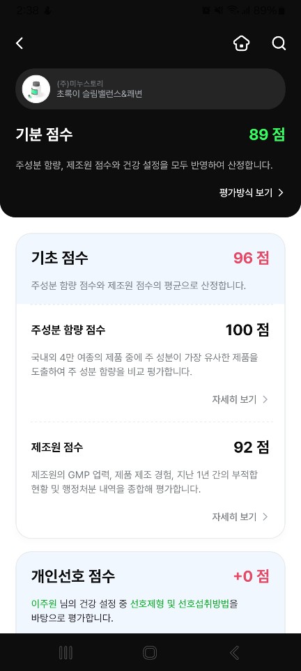 성분 함량 점수와 제조원 점수로 산출한 ‘올 뉴 초록이 시즌4’ 제품의 기초점수는 96점이다.