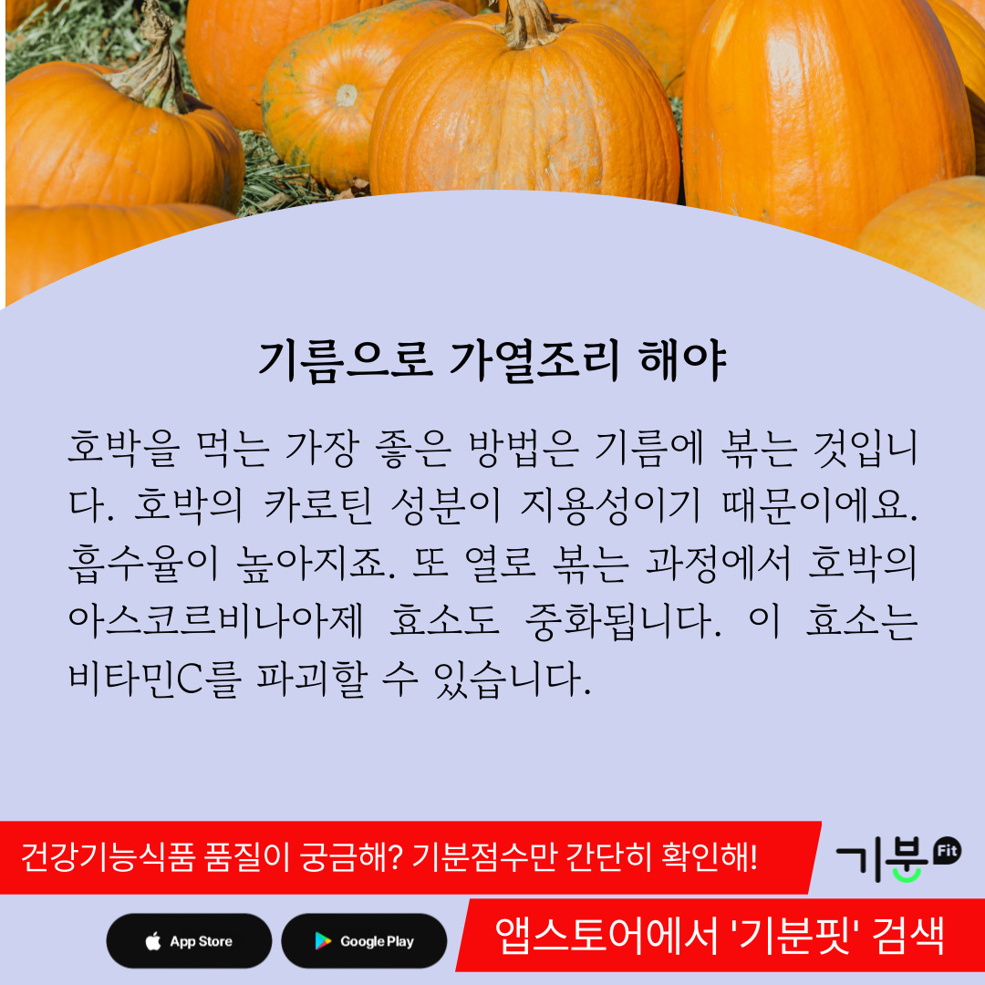 호박의 카로틴 성분은 지용성으로 기름에 녹아 나오기 때문에 기름으로 조리하면 흡수율을 더욱 높일 수 있다.