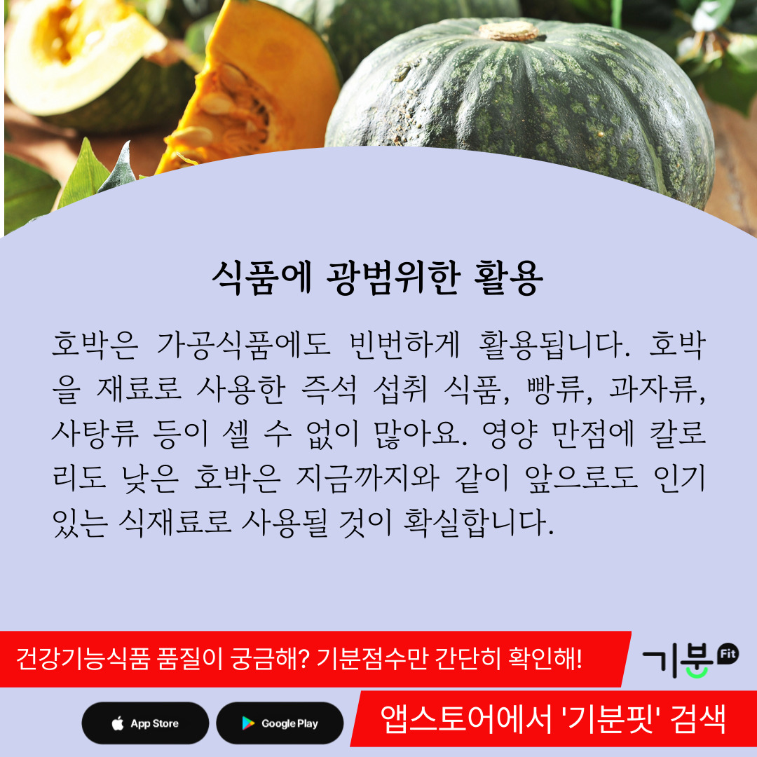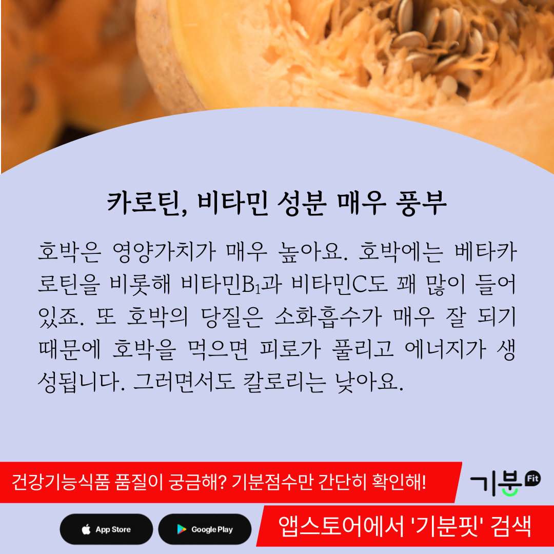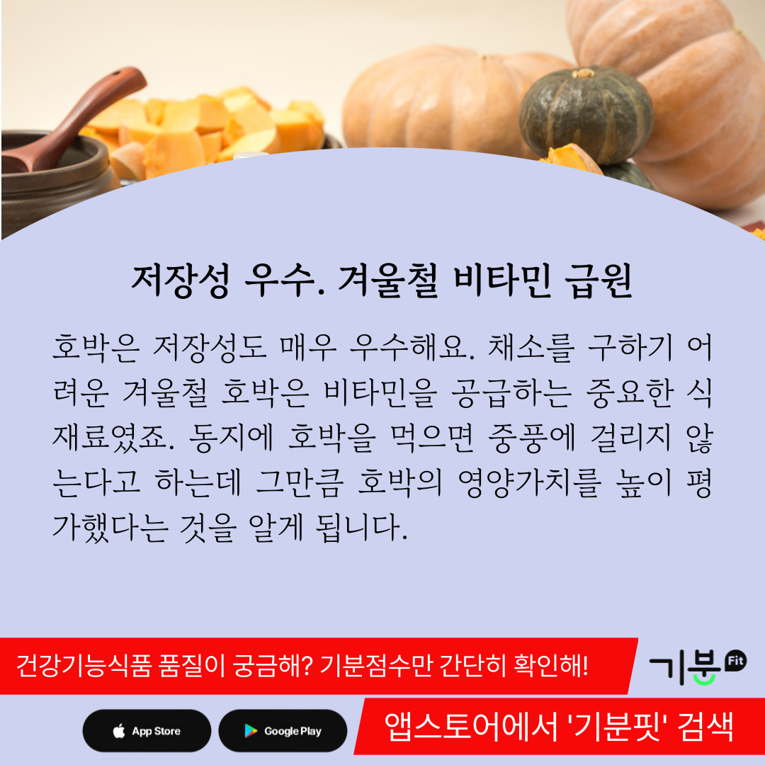또 호박에 함유된 당질은 소화흡수가 매우 잘되기 때문에 피로를 빨리 풀어주고 에너지를 생성해 주는 역할을 한다.