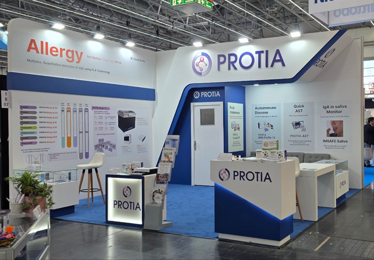 프로티아는 이번 전시회에서 약물·화학 알러젠을 포함해 176종을 단일 검사로 분석하는 알레르기 다중진단키트 ‘PROTIA Allergy-Q 192D’, 반려견·반려묘·말 알레르기 검사 제품 ‘ANTIA Canine/Feline/Equine IgE’, 자가면역질환 진단 패널 ‘PROTIA ANA Profile’, 항생제 감수성 진단(AST) 키트 ‘PROTIA AST DL001’, 침 기반 IgA 면역검사 ‘IMSAFE Saliva’ 등 인체·수의·면역·AST 분야를 아우르는 종합 체외진단 포트폴리오를 선보인다.