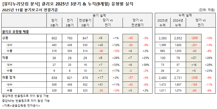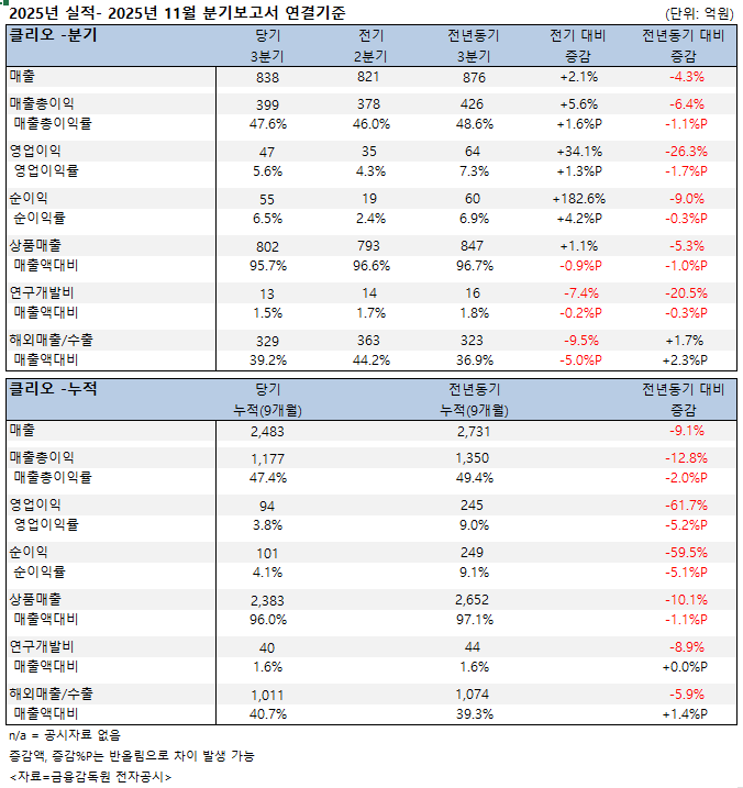 클리오는 올해 3분기 전기 대비 매출·영업이익·순이익이 모두 감소햇다. 내수와 수출 실적이 동반 하락했다. 그러나 2분기보다는 실적이 호전됐다. 특히 순이익은 180% 이상 급증했다.