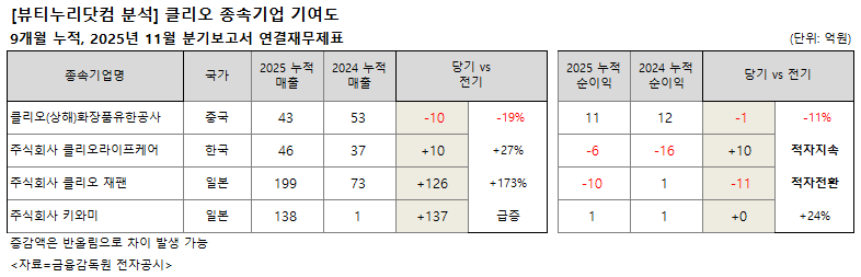 매출 비중이 가장 큰 일본의 주식회사 클리오 재팬은 10억원의 순손실을 기록, 1억원의 흑자를 냈던 전년동기 대비 적자전환했다. 매출은 199억원으로 전년동기 73억원 대비 173% 성장했다.