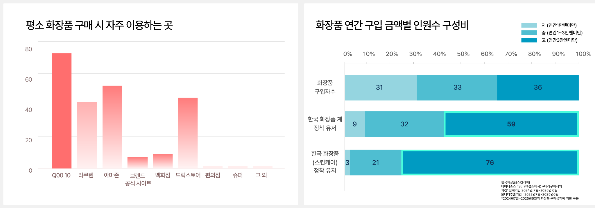 연간 화장품 구입 금액대별 분석에선 한국 화장품 정착 소비자의 76%가 연 3만엔 이상을 지출하는 고관여층으로 나타났다. 전체 화장품 구매자군에서 고액 소비층이 36% 수준인 것과 비교하면, K-뷰티 구매자들이 얼마나 적극적인 소비자인지를 보여 준다. 특히 스킨케어 정착 소비자에서 중·고액 지출 비중이 높았다(고 76). 효능·성분을 중시하는 정착층의 고액 지출 비중이 두드러지며, 단순히 ‘한류 화장품’이라는 이유보다 ‘효능을 신뢰해 반복 구매하는 소비자층’이 두텁게 형성되고 있다.