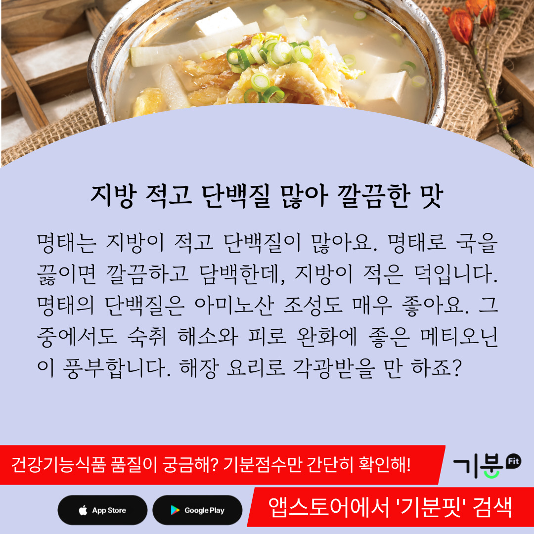 명태로 국을 끓이면 깔끔하고 담백한 맛을 낼 수 있는 것도 지방이 적기 때문이다.