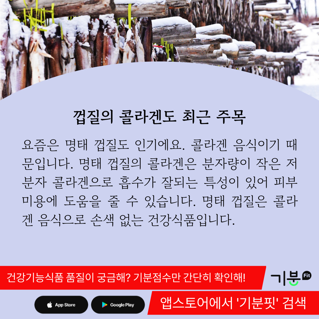 그러나 생선 콜라겐은 분자량이 비교적 작은 편이고 젤라틴 변성 역시 육상 동물 유래의 콜라겐보다는 더뎌서 콜라겐 보충용으로는 생선 껍질이 더 적합하다는 것이다.
