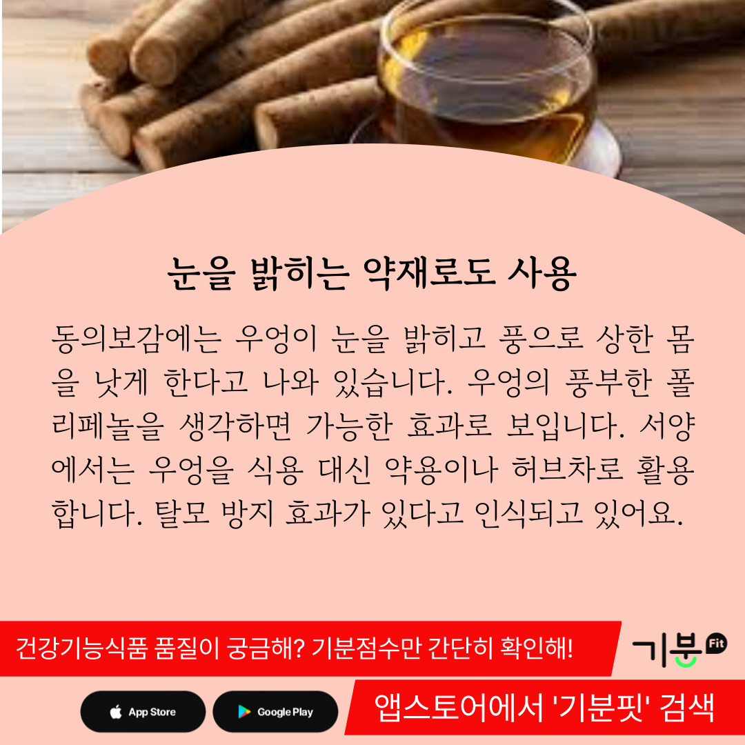 동의보감에서는 우엉이 눈을 밝히고 풍으로 상한 몸을 낫게 한다고 기술한다.