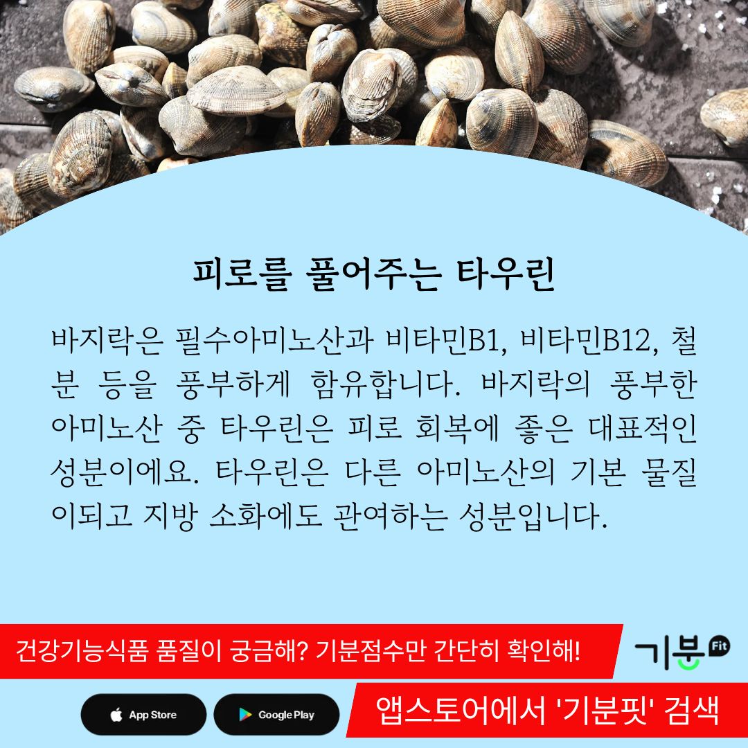 바지락의 풍부한 아미노산 중 타우린은 피로 회복에 좋은 대표적인 성분이다.