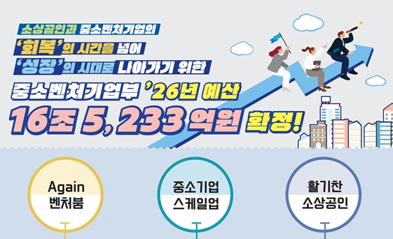 중소벤처기업부는 2026년도 예산을 총 16조5233억원 규모로 확정했다고 4일 밝혔다. 이는 전년보다 1조2745억원(8.4%) 증가한 수치로, 특히 중소기업 R&D 예산이 2조1959억원으로 확대돼 역대 최대 수준을 기록했다.