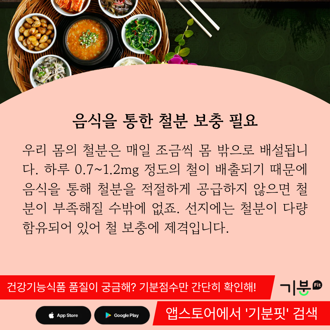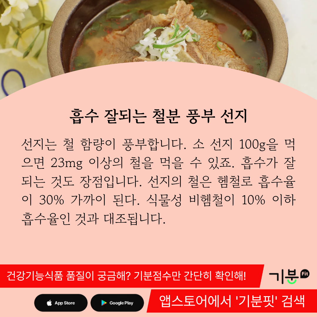 선지의 철분은 헴철로 흡수율이 30% 가까이 된다.
