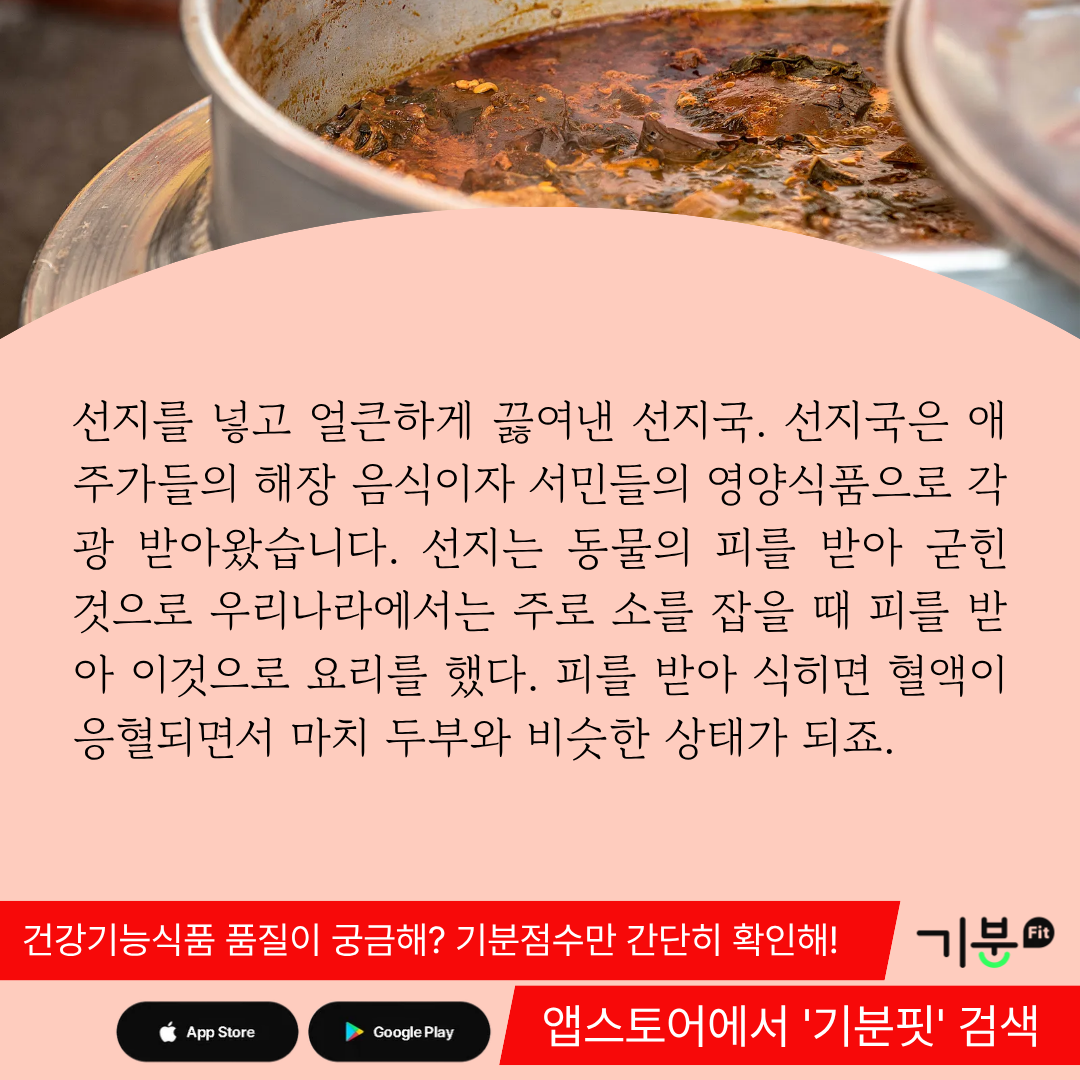 더구나 선지는 중금속을 흡착하는 성질도 있기 때문에 미세먼지 등 공해가 많은 환경에서 살아가는 사람들에게도 좋다.
