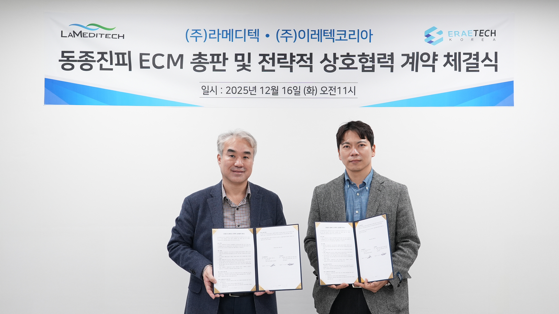 레이저 헬스케어 전문기업 ㈜라메디텍(대표이사 최종석)은 재생의료 바이오소재 전문기업 ㈜이레텍코리아와 무세포 동종진피(ECM, Extra Cellular Matrix) 제품에 대한 국내 총판 및 전략적 상호협력 계약을 16일 체결했다.
