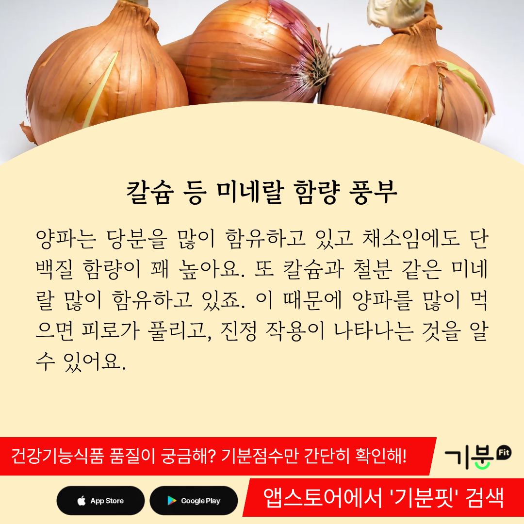 과거 민간에서는 신경쇠약, 불면증 등이 있으면 생양파를 먹게 했는데, 양파 속 칼슘이 가지고 있는 진정 작용이 어느 정도 효과를 발휘했으리라 유추할 수 있다.