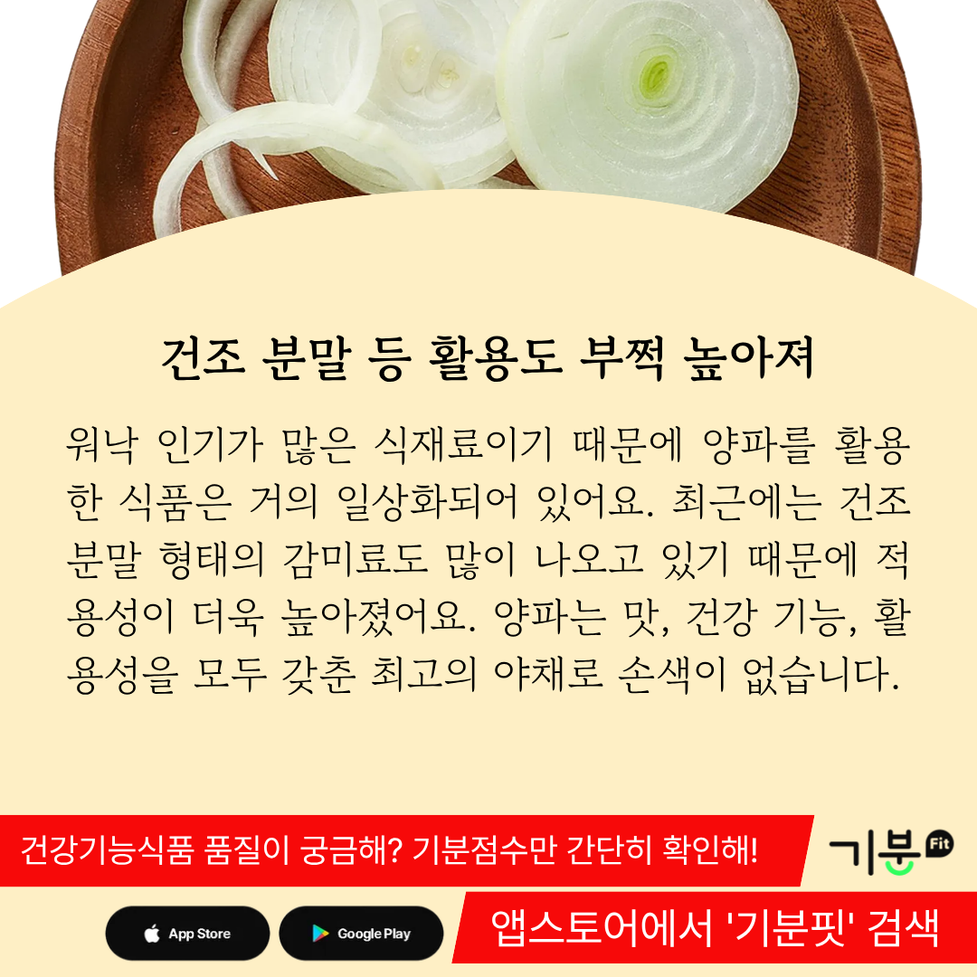 최근에는 양파 건조 분말 형태의 감미료도 많이 나오고 있기 때문에 가공식품으로 사용할 수 있는 적용성이 더욱 높아졌다.