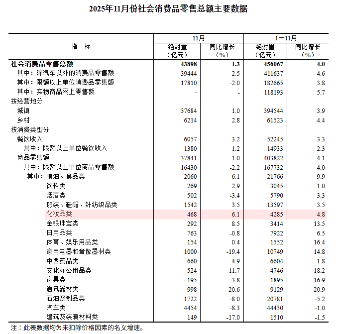 중국의 11월 소비재 총 소매 판매 데이터. 화장품 판매는 전년대비 6.1% 증가한 468억 위안으로 집계됐다. ⓒ중국 국가통계국