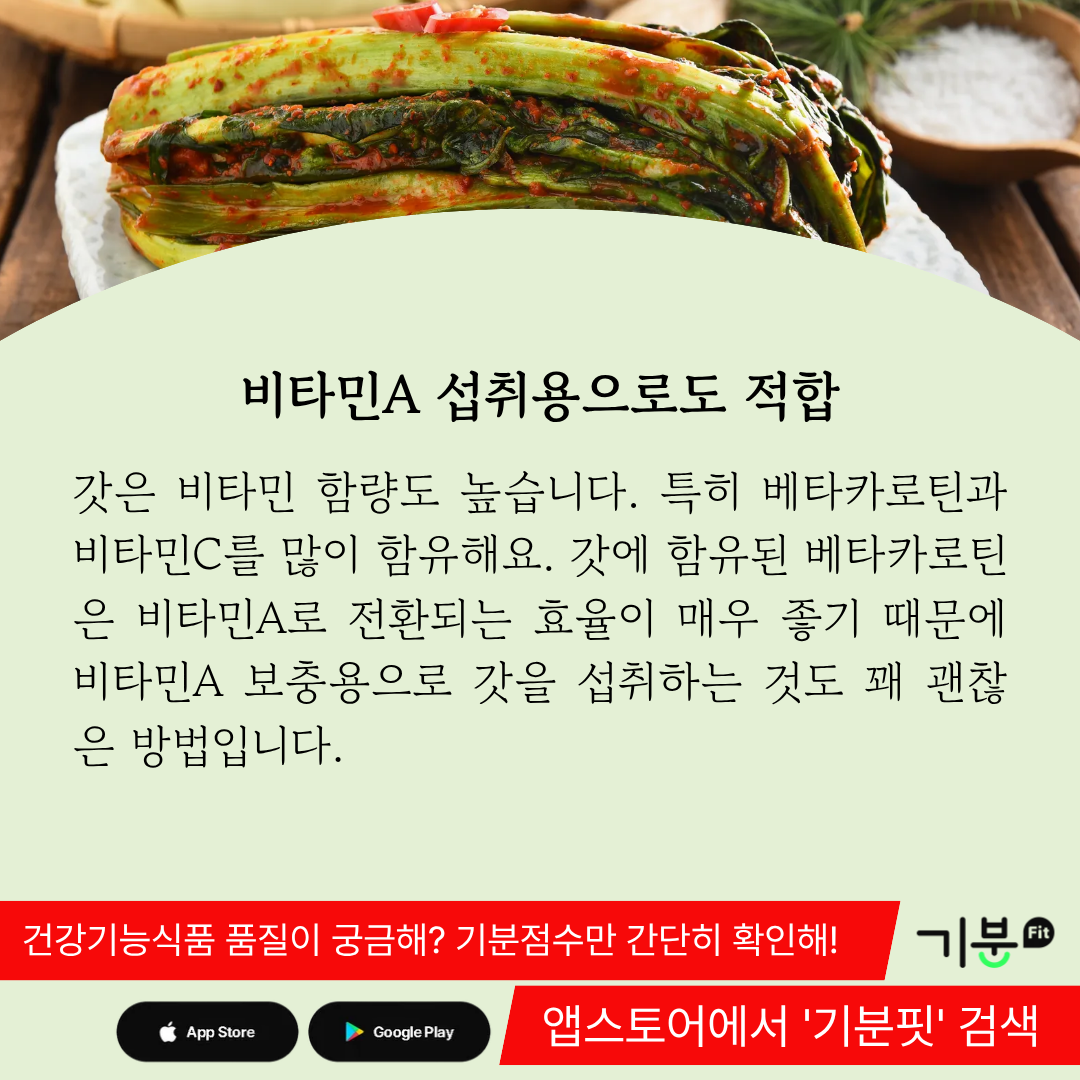 갓에 함유된 베타카로틴은 비타민A로 전환되는 효율이 매우 좋기 때문에 비타민A 보충용으로 갓을 섭취하는 것도 꽤 괜찮은 방법이다.